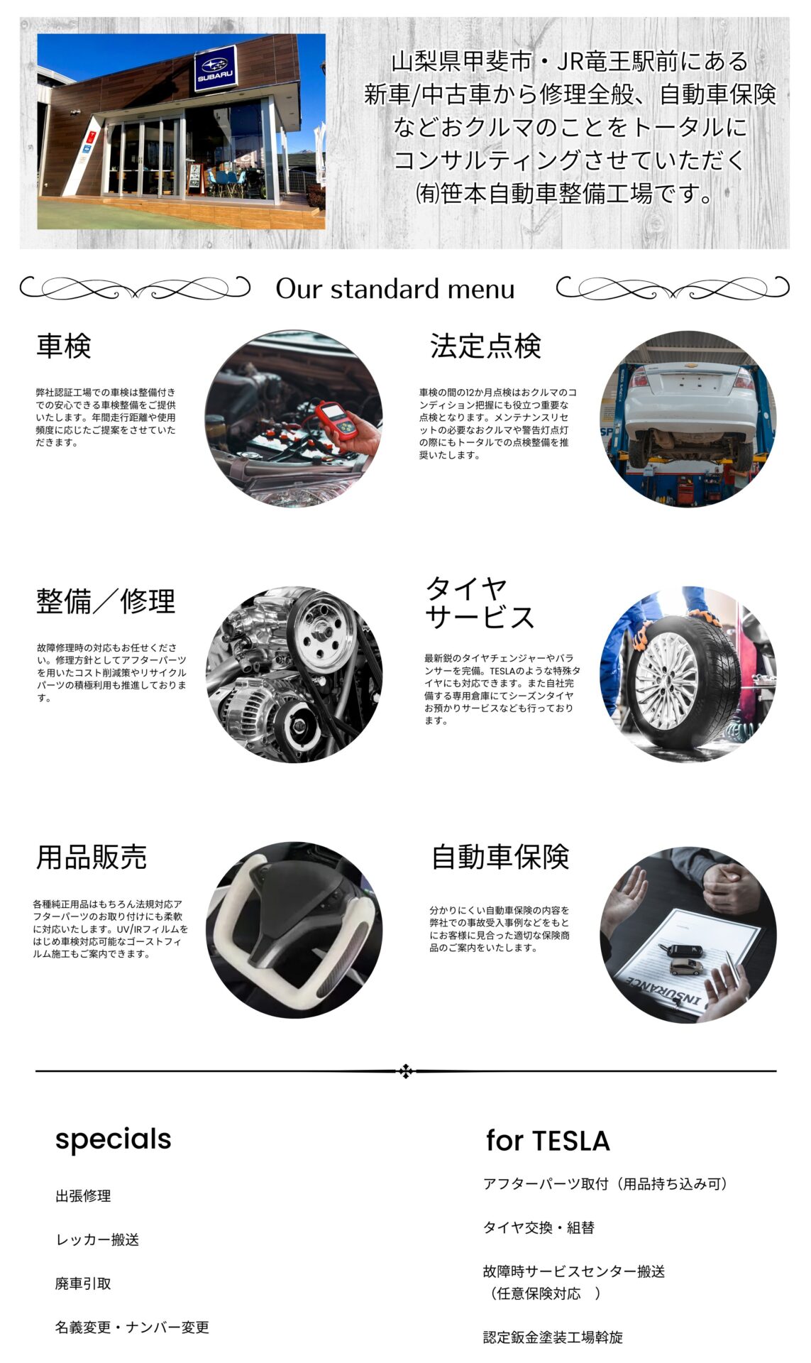 新車 中古車販売 国産車全般を取り扱います。特にSUBARUは販売代理店でもありメンテナンス/サービスにおいても自信がございます。 中古車販売は全国オークションからお客様のご希望に沿ったものをお探しできます。対面にてオークション出品をお選びいただけますのでこだわりのご希望にもお応えできます。 法定点検 車検 一般整備 法定点検、車検のご用命もお任せください。整備付きの車検ではお見積を前提に納得いただいたうえでの着手となります。全てにおいて整備スケジュールをご提案し、高額修理となりうるリスクを分散提案いたします。 最新ASV車両整備 自動ブレーキやトラフィックアウェアコントロールシステムをはじめとする先進機能搭載車両のトラブルにも対応ができます。各種メーカーの純正スキャンツールも取り揃えておりますので保証修理との兼ね合いもご相談いただけます。 EV(電気自動車)コンサルタント 自社でも黎明期よりEV車両を導入し、幅広く法人様や個人のお客様にもソリューションをご提供してきた実績がございます。またコンサルタントとしてディーラーへの出張講義やイベント出展での実績も多数あります。 XEAM山梨 甲斐(EVバイク販売代理店) 電動バイク販売部門「XEAM山梨甲斐店」を併設しております。原付相当クラスから大型車クラスまでラインナップがあり今までと違った世界をご体験できます。